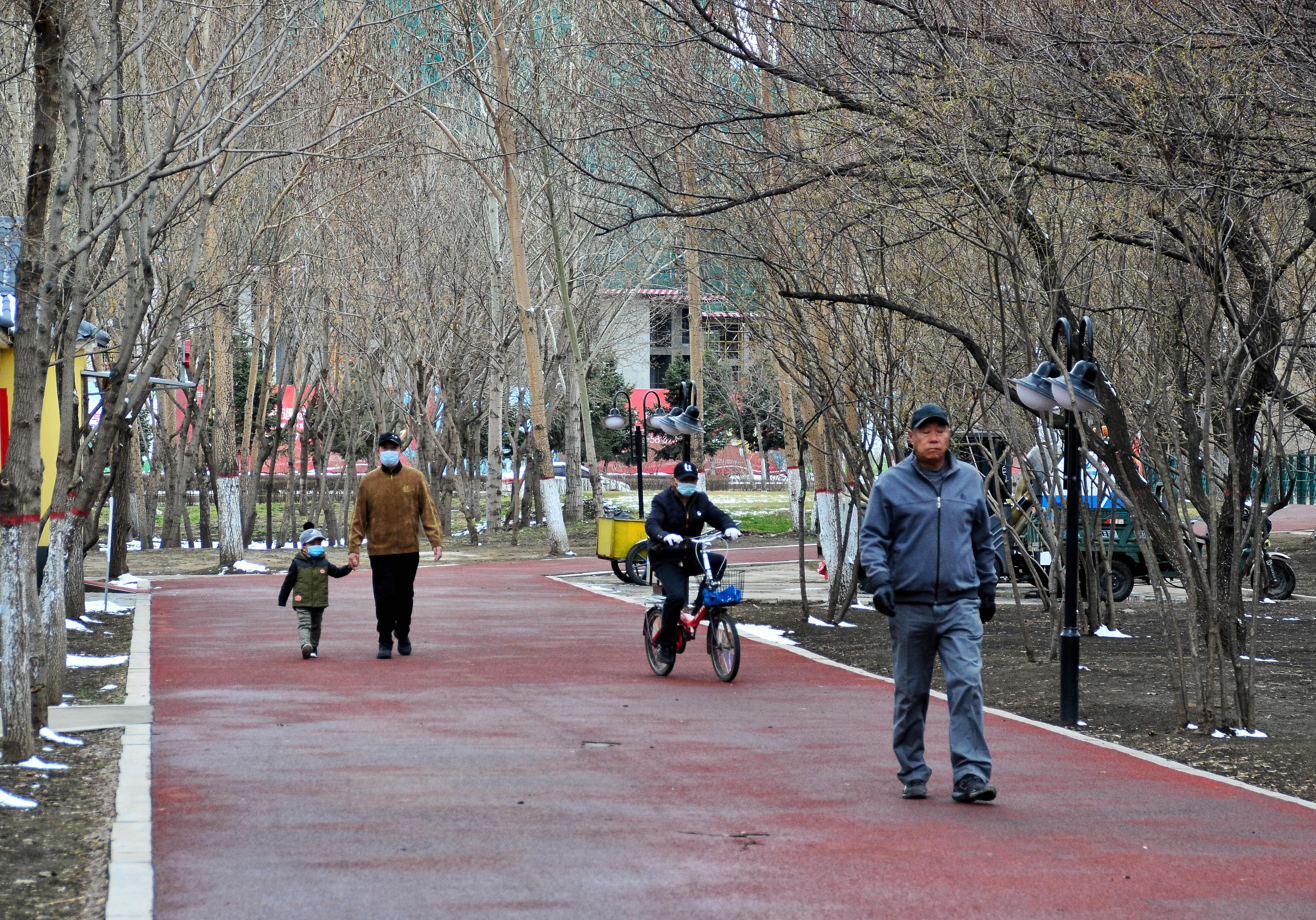 市民在新區(qū)中心公園散步