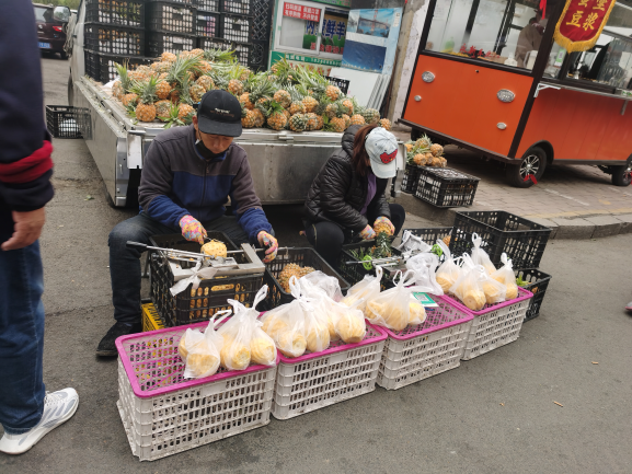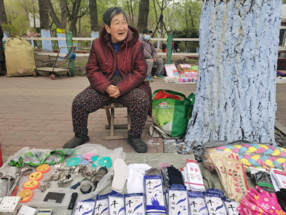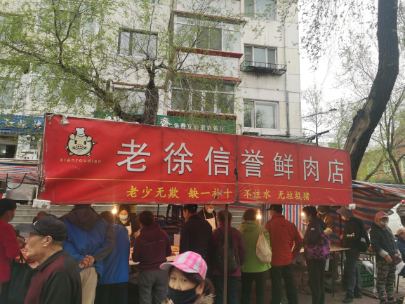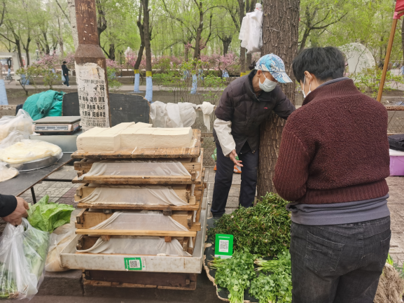 早市的吸引力在于“看”。早市上,各攤主會(huì)想各種各樣的方式招攬顧客,有的會(huì)用廣告牌,有的會(huì)吆喝。早市上的商業(yè)運(yùn)作方式也非常有趣,比如現(xiàn)場(chǎng)擠羊奶,旁邊拴幾頭奶羊,當(dāng)招牌;賣(mài)刀切面的現(xiàn)場(chǎng)切,炸油條的現(xiàn)場(chǎng)炸,都是明檔手工,這幾乎是大多數(shù)早市商家的促銷(xiāo)手段。也有推銷(xiāo)老花鏡的,賣(mài)衣服的,會(huì)現(xiàn)場(chǎng)吆喝“正宗商品專(zhuān)柜,清倉(cāng)促銷(xiāo)”——這大概是現(xiàn)在“直播帶貨”的線下模式。住在早市附近的居民,有的會(huì)在樓上用繩子吊下個(gè)籃子,讓攤主把東西放到籃子里,直接拽上去。