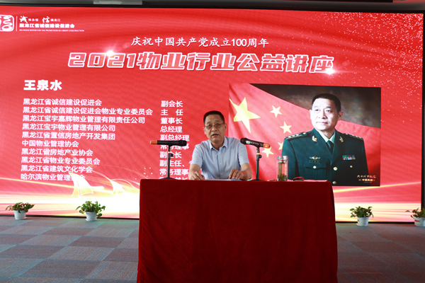 黑龍江省誠(chéng)信建設(shè)促進(jìn)會(huì)物業(yè)專(zhuān)業(yè)委員會(huì)主任、黑龍江寶宇物業(yè)公司總經(jīng)理 王泉水以《后疫情時(shí)代如何更好的開(kāi)展物業(yè)服務(wù)》為題做了專(zhuān)題講座。王泉水曾帶領(lǐng)全體員工連續(xù)創(chuàng)建國(guó)家示范項(xiàng)目4個(gè)、省級(jí)“十佳”項(xiàng)目5個(gè),其他管理項(xiàng)目全部創(chuàng)建為省級(jí)項(xiàng)目,先后在全省講授物業(yè)課18次、聽(tīng)眾3000余人,經(jīng)常接到物業(yè)人的電話和微信對(duì)相關(guān)事務(wù)的解答、解釋并給予指導(dǎo)和幫助。