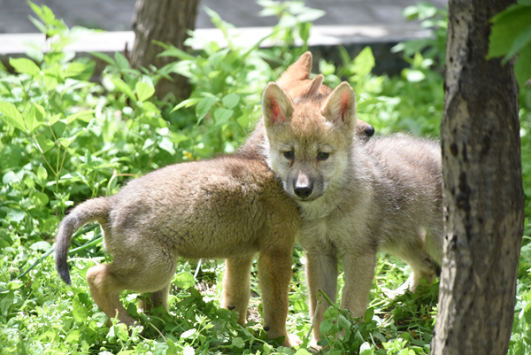 比起 “獨(dú)生子”的小羚羊,在狼散放區(qū)出生的小家伙們可真稱得上是大家庭了。同樣是四月份出生的狼崽們多達(dá)13只,新生娃數(shù)量目前在園里遙遙領(lǐng)先,他們分別來自于四個不同家庭,最多的一窩小狼崽有兄弟姐妹6個,最少的也是雙胞胎。這13只小狼崽斷奶后過起了集體生活,每天一起吃飯,一起睡覺,一起學(xué)習(xí),一起玩耍,簡直不要太熱鬧。尤其是白天在室外運(yùn)動場活動時,小狼崽們時而分成幾個小組活動,時而湊在一起,像一堆毛球擠成一團(tuán)。在這其中有一只小狼不到滿月就顯示出了狼王的天性,小尾巴翹的高高的,一幅天不怕地不怕的樣子誰都敢挑戰(zhàn),勇敢值爆表。飼養(yǎng)員說它具有狼王潛質(zhì),幾年后有可能成為新的狼王。