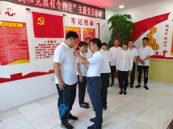 在馬林林場分會場,2名老黨員正在為預備黨員佩戴黨徽,這光榮的儀式對于新黨員來說是一種榮譽、一種激勵、一種鞭策,更是中國共產(chǎn)黨人精神的傳承。