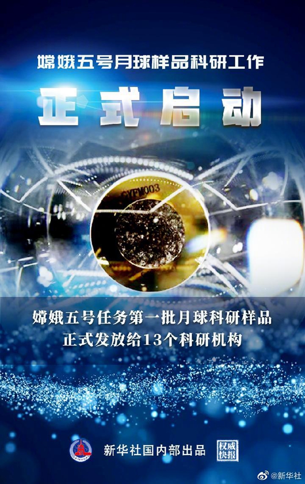 剛剛,國家航天局探月與航天工程中心在京舉行嫦娥五號任務第一批月球科研樣品發(fā)放儀式,標志著月球樣品科學研究工作正式啟動。經(jīng)審核,來自13所科研機構的31份申請獲得通過。(新華社記者 胡喆 海報設計 苗夏陽)