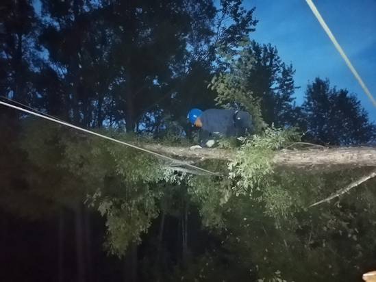飛機巡查發(fā)現(xiàn)的呼碧線128號電線桿和129號電線桿之間線路故障處,由呼中輸電運檢班組負(fù)責(zé)搶修,需搶修人員步行穿過密林和水道,經(jīng)過1個多小時的艱難跋涉方能到達(dá),現(xiàn)場電線上掛著一棵直徑40多厘米的風(fēng)倒樹,導(dǎo)致電線破損,搶修人員將風(fēng)倒樹用手鋸切割移除,并對破損電線進(jìn)行補強,截至21時30分,呼碧線兩處故障全部搶修完畢,呼中區(qū)陸續(xù)完成供電。