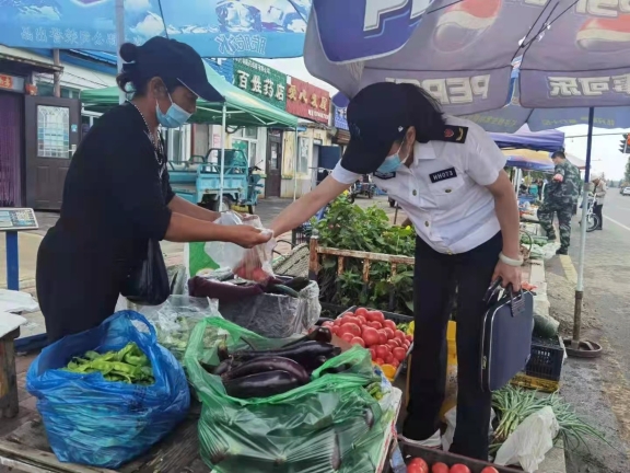 執(zhí)法人員現(xiàn)場(chǎng)發(fā)放《黑河市市場(chǎng)監(jiān)督管理局食品安全“你點(diǎn)我檢”調(diào)研問(wèn)卷》46份,并根據(jù)調(diào)研問(wèn)卷統(tǒng)計(jì)結(jié)果隨機(jī)抽取大集上售賣的熟食、水果、蔬菜等樣品。