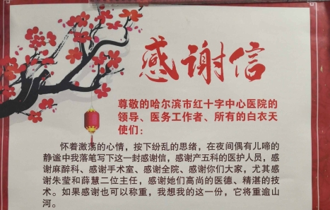 黑龍江經(jīng)濟(jì)網(wǎng)訊(孫麗霞 葉鴻 梁新立)“懷著激蕩的心情,按下紛亂的思緒,在夜間偶有兒啼的靜謐中我落筆寫下這一封感謝信……如果感謝也可以稱重,我想我的這一份,它將重逾山河?!苯?,哈爾濱市紅十字中心醫(yī)院(哈爾濱醫(yī)科大學(xué)附屬哈爾濱婦產(chǎn)醫(yī)院)產(chǎn)五科收到了來自患者家屬李先生的一封感謝信和一面錦旗。