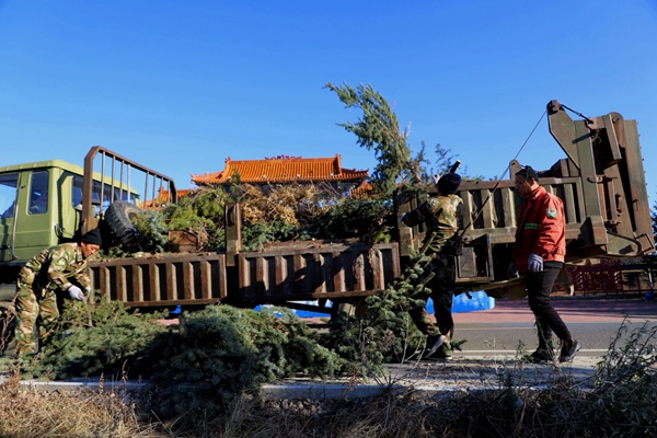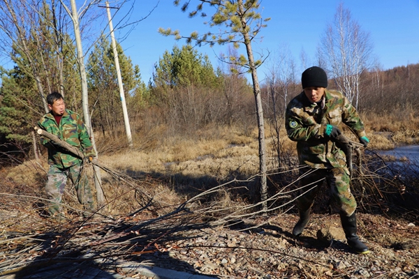 圖為阿木爾林業(yè)局森林消防大隊專業(yè)撲火隊員將修剪下來的樹枝裝車運(yùn)走(王力/攝)