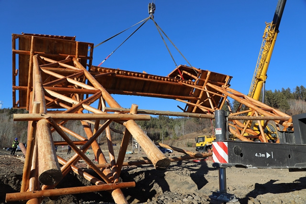 早上10點(diǎn)58分,只見平靜的林業(yè)局薩布素軍馬場頓時(shí)熱鬧了起來,兩臺(tái)大型起重機(jī)發(fā)動(dòng)機(jī)嗡嗡作響,一東一西緩慢吊起10多噸重的大門,因偏向一側(cè)首次作業(yè)沒有成功。安裝技術(shù)人員調(diào)整重心點(diǎn),第二次試舉,并在一臺(tái)裝載機(jī)的協(xié)助下,調(diào)整機(jī)位,歷時(shí)2個(gè)多小時(shí),才將具有濃郁驛站文化風(fēng)格的高10米、寬14米的木質(zhì)大門,矗立在平地上。