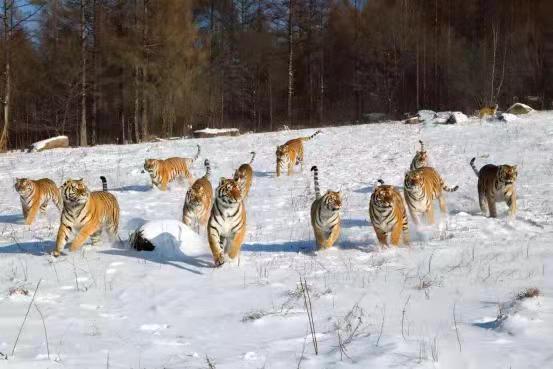 令人震撼的鏡泊湖吊水樓的冰瀑是牡丹江冬季的重要景點之一。在冰凌交錯、銀裝素裹的純凈世界里,世界吉尼斯紀(jì)錄創(chuàng)造者——中國懸崖跳水奇人狄煥然,在零下二十多度的鏡泊湖吊水樓冰瀑上,伸展雙臂,凌空一躍,撲向不結(jié)冰的黑龍?zhí)端妫肼洳罱?0米的水中,成為鏡泊湖景區(qū)冬季的一道獨特景觀。鏡泊湖水系水質(zhì)較好,水產(chǎn)資源極為豐富,大約有六十多種魚,冬季體驗鏡泊湖的大網(wǎng)捕魚、小網(wǎng)掛魚,在每年辭舊迎新之際看一場冬捕,絕對是預(yù)示著年年有余好兆頭的絕佳體驗。在漁夫們高亢的號子聲中,800多米長的大網(wǎng)從冰洞中漸漸滑出,胖頭魚、鯽魚、鯉魚等翻滾著、跳躍著,冒著熱氣蹦到冰面,“萬尾鮮魚出玉門”的奇觀景象讓人感嘆不已。橫道東北虎林園是世界上最大的東北虎人工飼養(yǎng)繁育基地和野化訓(xùn)練基地。在幾代養(yǎng)虎人的辛勤努力下,已繁育活體東北虎1100余只,建有猛虎園、靈長類館、幼虎生態(tài)館、高空玻璃棧道、珍稀動物觀賞園、科普展覽館、觀虎長廊、虎文化廣場等多個景點。在這里,可以感受到獸中之王奔跑在蒼茫林海雪原的風(fēng)馳電掣。也可以感受到成群東北虎躺臥在皚皚白雪“互談心事”的百般愜意,還可以領(lǐng)略到虎牛相斗、群虎撲食的驚險刺激。