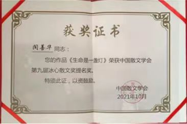 黑龍江經(jīng)濟(jì)網(wǎng)訊(牟璐 周楠 記者馬朝林)備受關(guān)注的“第九屆冰心散文獎(jiǎng)”評(píng)獎(jiǎng)結(jié)果公布,黑龍江省塔河縣作協(xié)主席閆善華的散文單篇《生命是一盞燈》榜上有名。