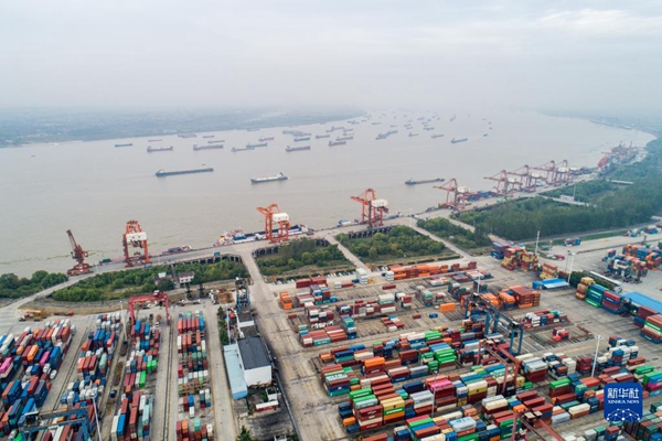 這是10月19日拍攝的武漢陽(yáng)邏港一期碼頭(無(wú)人機(jī)照片)。新華社發(fā)(伍志尊攝)