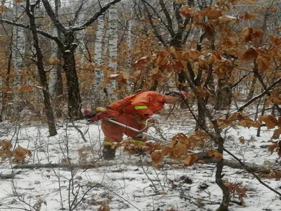 在經(jīng)過一段緊張嚴格的產(chǎn)前技能及安全培訓(xùn)后,紅星林場職工們備齊生產(chǎn)工具和防護物品,每天頂著未褪盡的夜色出發(fā),天剛冒亮就開工,在積雪覆蓋的林間不停穿行,鋸手手持割灌機把作業(yè)規(guī)程要求的各類林內(nèi)枯死、風(fēng)折枝干伐除,后面的歸堆工緊隨其后,把割下的枯干枝條有序的理順碼成堆。各小組分工明確,配合嫻熟,漫山雜亂的倒木藤條在工人們的手下被梳理的清晰利落,寂靜的山林也在機器的轟鳴和工人們的笑聲中熱鬧起來。