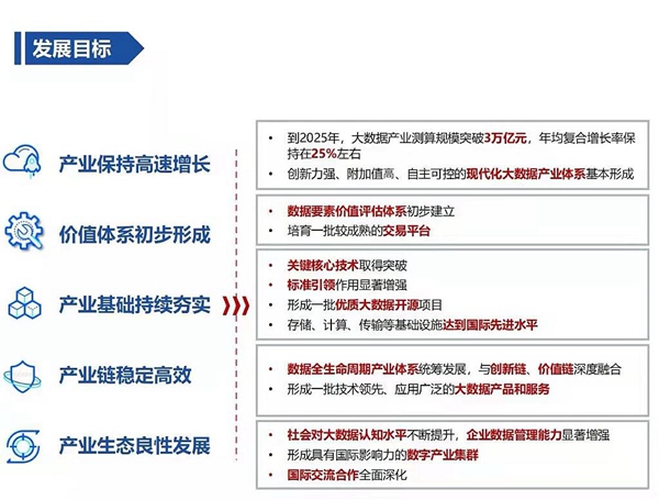 規(guī)劃明確,到2025年,大數(shù)據(jù)產(chǎn)業(yè)測(cè)算規(guī)模突破3萬億元。其中特別提出,數(shù)據(jù)要素價(jià)值評(píng)估體系初步建立;產(chǎn)業(yè)基礎(chǔ)持續(xù)夯實(shí),關(guān)鍵核心技術(shù)取得突破;形成一批技術(shù)領(lǐng)先、應(yīng)用廣泛的大數(shù)據(jù)產(chǎn)品和服務(wù)。