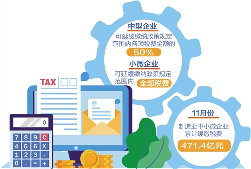 剛剛過去的11月是制造業(yè)中小微企業(yè)階段性稅收緩繳政策實(shí)施首月。12月1日,國家稅務(wù)總局發(fā)布統(tǒng)計(jì)數(shù)據(jù)顯示,這項(xiàng)政策實(shí)施效果顯著,制造業(yè)中小微企業(yè)已累計(jì)緩繳稅費(fèi)471.4億元。