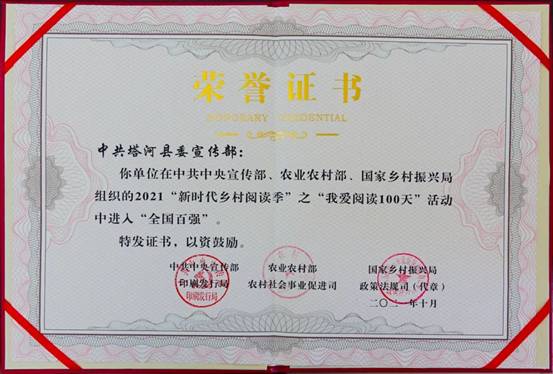 塔河縣委宣傳部在2020、2021連續(xù)兩年榮獲“新時(shí)代鄉(xiāng)村閱讀季”全國百強(qiáng)榮譽(yù)稱號(hào),