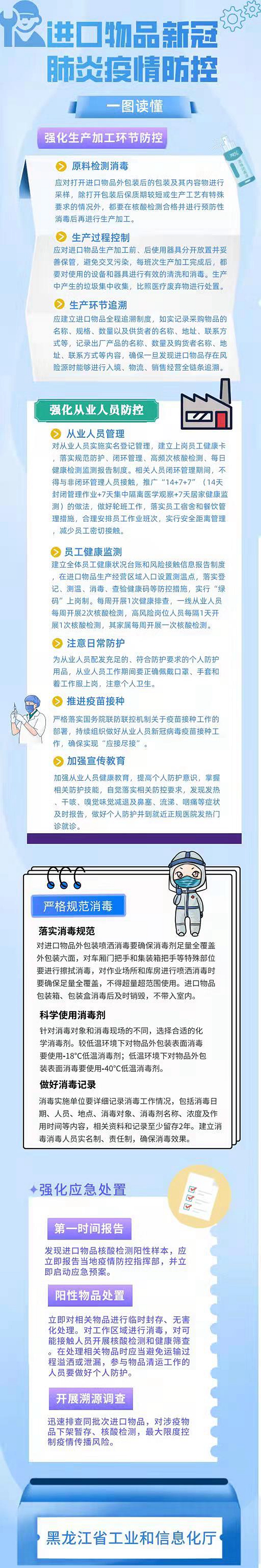 公開信表示,近期疫情反彈形勢(shì)嚴(yán)峻復(fù)雜,為確保工業(yè)企業(yè)不發(fā)生聚集性疫情,共同構(gòu)筑疫情防控堅(jiān)固防線,提示:涉及進(jìn)口物品加工、使用的工業(yè)企業(yè)要嚴(yán)格按照《黑龍江省進(jìn)口物品新冠肺炎疫情風(fēng)險(xiǎn)防控工作方案》落實(shí)各項(xiàng)防疫措施。一要強(qiáng)化生產(chǎn)加工環(huán)節(jié)的防控。生產(chǎn)前做好原料檢測(cè)消毒,生產(chǎn)中做好過程控制,設(shè)備和器具進(jìn)行有效的清洗和消毒避免交叉污染,產(chǎn)生的垃圾集中收集,比照醫(yī)療廢棄物進(jìn)行處置。建立進(jìn)口物品全程追溯制度,確保一旦發(fā)現(xiàn)進(jìn)口物品存在風(fēng)險(xiǎn)源時(shí)能夠進(jìn)行入境、物流、銷售經(jīng)營(yíng)全鏈條追溯。二要強(qiáng)化從業(yè)人員防控。對(duì)員工實(shí)施實(shí)名登記管理,做好員工健康監(jiān)測(cè)和核酸檢測(cè),合理安排作業(yè)班次,減少密切接觸。配發(fā)充足并符合防護(hù)要求的個(gè)人防護(hù)用品,加強(qiáng)員工健康教育,提高個(gè)人防護(hù)意識(shí)。嚴(yán)格落實(shí)當(dāng)?shù)仃P(guān)于疫苗接種工作的部署,持續(xù)組織做好員工新冠病毒疫苗接種工作,確保實(shí)現(xiàn)“應(yīng)接盡接”。三要嚴(yán)格規(guī)范消毒。對(duì)進(jìn)口物品外包裝、加工場(chǎng)所、車廂門把手和集裝箱把手等要嚴(yán)格按照規(guī)范消毒,消毒時(shí)要確保足量全覆蓋并針對(duì)消毒對(duì)象和消毒現(xiàn)場(chǎng)的不同選擇合適的化學(xué)消毒劑。詳細(xì)記錄消毒工作情況,建立消毒人員實(shí)名制、責(zé)任制,確保消毒效果。四要強(qiáng)化應(yīng)急處置。發(fā)現(xiàn)進(jìn)口物品核酸監(jiān)測(cè)陽性樣本,應(yīng)立即報(bào)告當(dāng)?shù)匾咔榉揽刂笓]部,并同步啟動(dòng)應(yīng)急預(yù)案。對(duì)相關(guān)物品進(jìn)行臨時(shí)封存、無害化處理,對(duì)工作區(qū)域進(jìn)行消毒,對(duì)可能接觸的人員開展核酸檢測(cè)和健康篩查。迅速排查同批次進(jìn)口物品,最大限度控制疫情傳播風(fēng)險(xiǎn)。