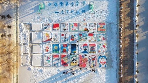 雪后的籃球場,變身為學生們的巨型畫板,大家在這里以“迎接建黨100周年”、“迎接北京2022冬奧會”為主題,在雪地上涂鴉,把雪后的校園裝扮得與眾不同。學生們發(fā)揮想象,用色彩描繪出更快、更高、更強的奧林匹克精神,以涂鴉展現(xiàn)著當代中學生的青春風采。