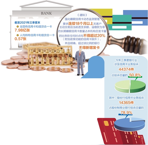 近年來,我國(guó)銀行業(yè)金融機(jī)構(gòu)信用卡業(yè)務(wù)快速發(fā)展,在便利群眾支付和日常消費(fèi)等方面發(fā)揮了重要作用。人民銀行發(fā)布的數(shù)據(jù)顯示,截至2021年三季度末,全國(guó)有信用卡和借貸合一卡7.98億張,人均持有信用卡和借貸合一卡0.57張。發(fā)卡量激增的同時(shí),行業(yè)亂象也被各界詬病,尤其是消費(fèi)者針對(duì)信用卡過度營(yíng)銷、亂收費(fèi)等問題的投訴量近年來居高不下。