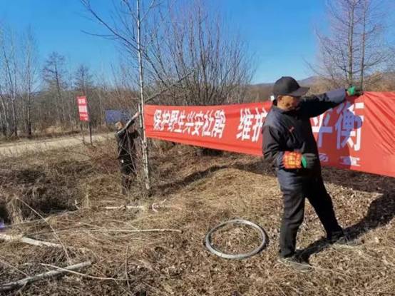圖為新林林業(yè)局新林林場(chǎng)工作人員在懸掛保護(hù)野生興安杜鵑條幅(楊光 攝)