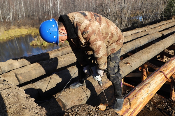 阿木爾林業(yè)局多種經(jīng)營公司職工李訓武在修復水毀橋梁(王力 攝)