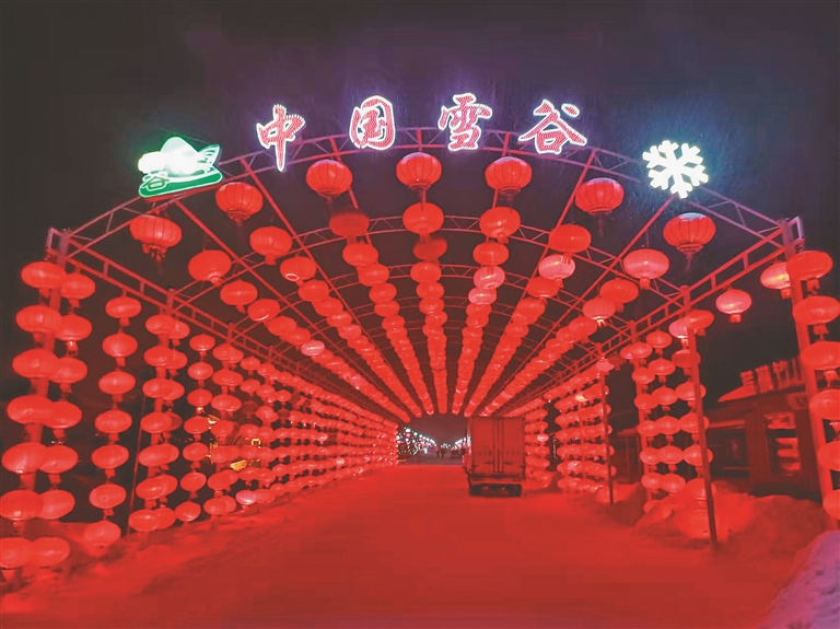 當我們抵達雪谷的時候,暮色已濃,天地間覆蓋了一片黑色的幕布。但雪谷中心街道上,聳立著由上千只大紅燈籠排列組合的拱形門,燈火輝煌,延續(xù)百米開外。門的頂端中央鑲嵌著“中國雪谷”四個金色大字,格外醒目。我們停下車拍照,并就近住宿,溫暖的火炕讓我們很快進入夢鄉(xiāng)。