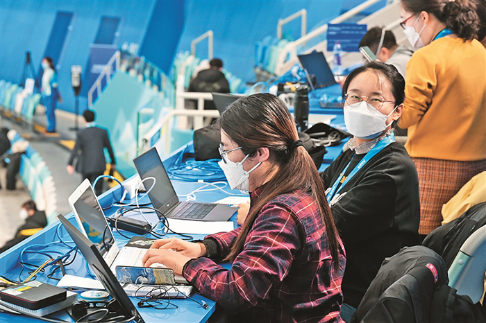 本報(bào)特派記者在冰絲帶現(xiàn)場(chǎng)寫(xiě)稿。