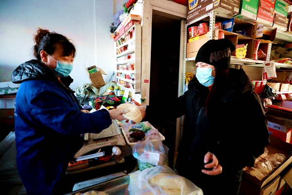 阿木爾林業(yè)局周周蔬菜水果店經(jīng)營(yíng)業(yè)戶(hù)周麗霞(左)向客戶(hù)銷(xiāo)售“依林河手搟面”(王力 攝)
