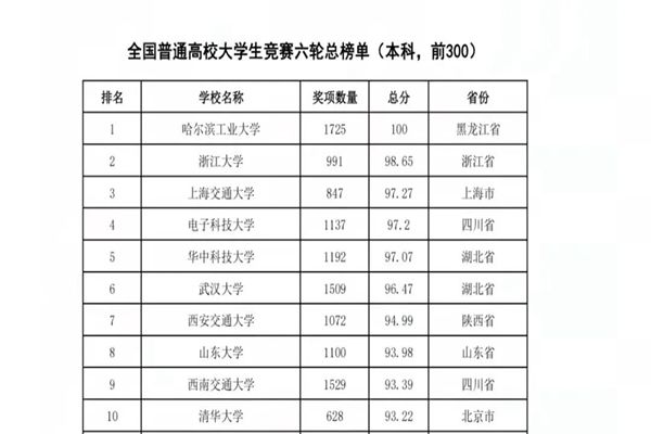 哈爾濱工業(yè)大學(xué)以獲獎數(shù)量1725項、總分100分的絕對優(yōu)勢獲得全國普通高校大學(xué)生競賽六輪總榜單冠軍。