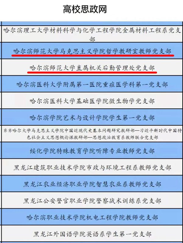 黑龍江經(jīng)濟網(wǎng)訊(黑龍江日報全媒體見習(xí)記者董廣碩 商祺)根據(jù)《教育部辦公廳關(guān)于開展第三批新時代高校黨建示范創(chuàng)建和質(zhì)量創(chuàng)優(yōu)工作的通知》要求,經(jīng)哈爾濱師范大學(xué)校黨委組織申報、省級黨委教育工作部門推薦、資格審查、專家評審、教育部黨的建設(shè)和全面從嚴治黨工作領(lǐng)導(dǎo)小組成員單位集中審議、結(jié)果公示,遴選產(chǎn)生了全國黨建工作示范高校、標(biāo)桿院系和樣板支部。哈爾濱師范大學(xué)馬克思主義學(xué)院哲學(xué)教研室教師黨支部和直屬機關(guān)后勤管理處黨支部獲批“全國黨建工作樣板支部”。到目前為止,哈爾濱師范大學(xué)共獲批1個全國黨建工作標(biāo)桿院系,4個全國黨建工作樣板支部,1個全國研究生樣板黨支部,獲批數(shù)量居于省屬高校首位。
