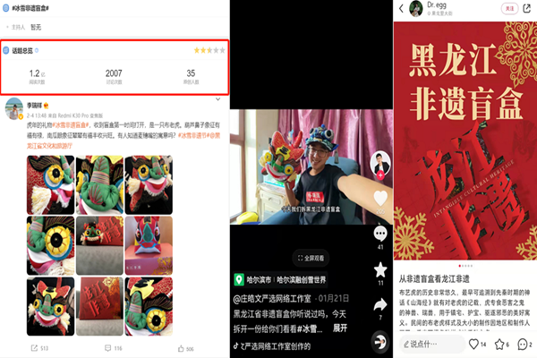 該項活動由哈爾濱品趣文化傳媒有限公司承辦,新華網(wǎng)、東北網(wǎng)、騰訊、今日頭條等媒體進行了報道,累計報道30余次;獲微博、抖音、小紅書等平臺KOL、KOC參與轉發(fā);微博#冰雪非遺盲盒#話題曝光量超1.2億人次;抖音、小紅書等平臺曝光量約20萬人次。