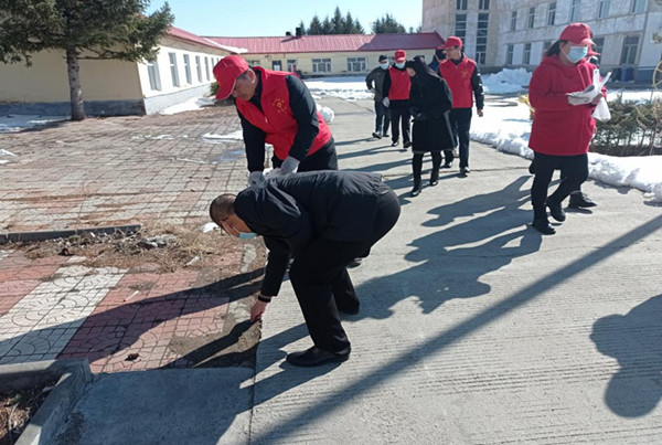 大烏蘇林場(chǎng)干部職工在綠化帶邊緣清理煙頭(汝愛(ài)麗 攝)