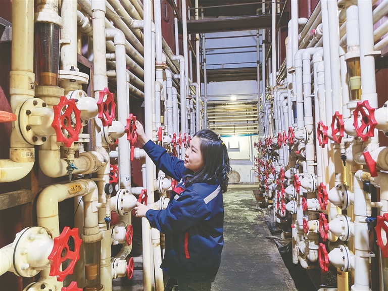 工人對(duì)糖液進(jìn)行凈化提純。