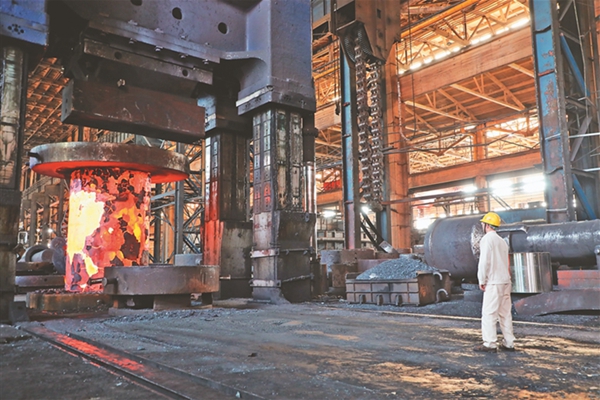 在中國一重集團(tuán)有限公司,工人在車間內(nèi)忙碌(5月19日攝)。 新華社記者 唐鐵富攝