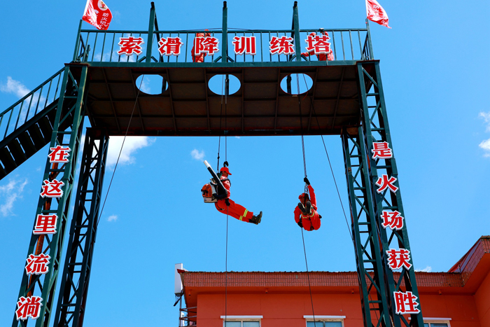 阿木爾林業(yè)局專(zhuān)業(yè)撲火隊(duì)員進(jìn)行索滑降訓(xùn)練(王力 攝)