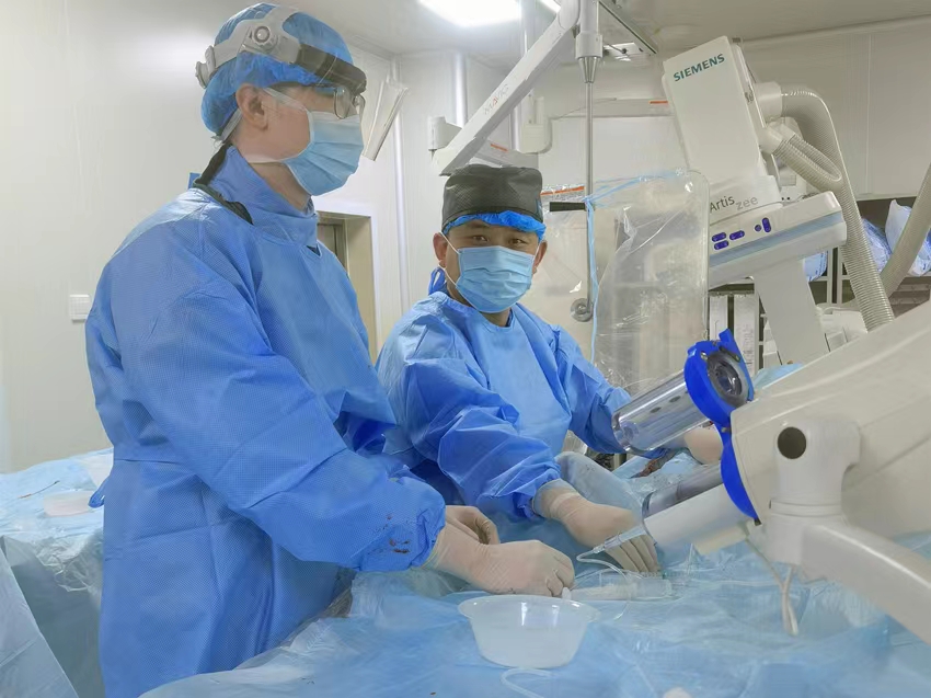 “患者入院后雖進(jìn)行了快速靜脈溶栓,但病情依然進(jìn)展性加重,我們發(fā)現(xiàn)患者病情為顱內(nèi)主干血管閉塞導(dǎo)致,情況十分危急,如果不及時(shí)介入開(kāi)通閉塞的顱內(nèi)大血管,一旦錯(cuò)過(guò)治療最佳時(shí)機(jī),患者就可能會(huì)出現(xiàn)危及性命等情況?!泵F副主任醫(yī)師回憶了當(dāng)時(shí)搶救情景。搶救刻不容緩,在爭(zhēng)得家屬同意并簽字后,神經(jīng)介入團(tuán)隊(duì)立即將張先生送至導(dǎo)管室進(jìn)行介入取栓治療。