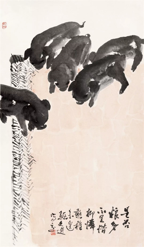 湯文選的人物、山水、花鳥(niǎo)、墨虎等一系列作品,融會(huì)著、貫穿著“三種傳統(tǒng)”。或隱或顯,或化解之,或凝聚之,或熔裁之,或獨(dú)造之?!叭N傳統(tǒng)”,可概括為現(xiàn)實(shí)主義在中國(guó)畫(huà)發(fā)展歷程中的三段式,亦曰交叉出現(xiàn)的不同歷史內(nèi)涵、文化反映的三種藝術(shù)狀態(tài):首先,是古代現(xiàn)實(shí)主義傳統(tǒng)——“外師造化,中得心源”。其二,是“五四”現(xiàn)實(shí)主義傳統(tǒng)——融合西法,崇尚寫(xiě)實(shí)。其三,是新中國(guó)成立后倡導(dǎo)的革命現(xiàn)實(shí)主義傳統(tǒng)。深入火熱斗爭(zhēng),深入工農(nóng)兵。學(xué)習(xí)延安木刻,學(xué)習(xí)民間年畫(huà),學(xué)習(xí)蘇聯(lián)油畫(huà)現(xiàn)實(shí)主義的創(chuàng)作方法(50年代)。其后,“一手伸向生活,一手伸向傳統(tǒng)”(60年代)。在以上“三種傳統(tǒng)”的交匯點(diǎn)上,伸延出湯文選早期和中期的現(xiàn)實(shí)主義創(chuàng)作之路。湯文選中國(guó)畫(huà)藝術(shù)的現(xiàn)實(shí)主義,其主要特征為積極的入世態(tài)度,強(qiáng)烈的人文主義色彩,個(gè)性、民族性與時(shí)代性的完美統(tǒng)一,以及嚴(yán)肅的歷史使命感。