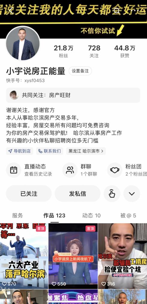 “松北這個小區(qū),現(xiàn)房7000起步”、“這里是江南核心商業(yè)圈,通勤便利”、“這可以說是哈爾濱二環(huán)旁配套設施最全的樓盤”……晚上8點,每當夜幕降臨,房產主播小宇(快手ID:xysf0453)會準時出現(xiàn)在快手平臺直播間,為廣大有購房需求的客戶答疑解惑。
