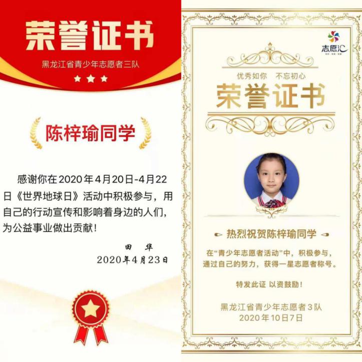 陳梓瑜同學熱衷于志愿服務活動。連續(xù)三期參與了為貧困小學捐書志愿活動、“美化井蓋·建文明城市”系列志愿服務、積極參與“雛雁計劃助學活動”,她積極組織策劃了 “小小圖書管理員·你我共建”志愿活動、“垃圾分類小衛(wèi)士”志愿活動、幫助哈爾濱市公安局推廣“防詐騙軟件志愿活動”。