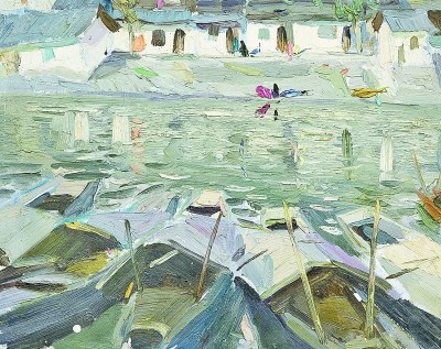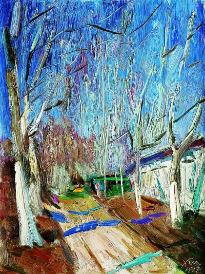 在諶北新的代表性作品里,無(wú)論何種結(jié)構(gòu),色調(diào)、筆觸、造型、線(xiàn)條都可以獨(dú)立觀賞。一塊厚堆的白色顏料,可以是云朵、是白墻,或是前后重疊的船帆。用筆的疏密、狀貌和節(jié)奏都有獨(dú)立存在的意義,既可以像欣賞書(shū)法用筆一樣拋開(kāi)物象去體味,又可以去想象和填補(bǔ)與之恰合的物象和自然關(guān)系。諶北新對(duì)書(shū)法的深入研究和長(zhǎng)期的繪畫(huà)寫(xiě)生,以及他對(duì)物象、空間、色彩關(guān)系的觀察與創(chuàng)造實(shí)踐,使其作品能夠?qū)⒉煌谋憩F(xiàn)手法有機(jī)地融為一體。比如一筆畫(huà)下去,既表現(xiàn)空間層次,也體現(xiàn)厚薄輕重,同時(shí)展現(xiàn)光線(xiàn)的微妙變化。這種綜合性的呈現(xiàn)效果,實(shí)際上也契合著中國(guó)山水畫(huà)所追求的通過(guò)用筆的輕重緩急,通過(guò)虛實(shí)濃淡的墨色渲染,通過(guò)遠(yuǎn)近高低的畫(huà)面布局,表現(xiàn)山水對(duì)人的情感與心靈的影響。而諶北新的風(fēng)景油畫(huà),正是基于中國(guó)人對(duì)山川草木的喜愛(ài)之情,通過(guò)體察和探求提煉出的獨(dú)特意象,它符合現(xiàn)代人的心理需求,也呼應(yīng)著畫(huà)家畢生追求的藝術(shù)境界——須其自來(lái),不以力構(gòu)。
