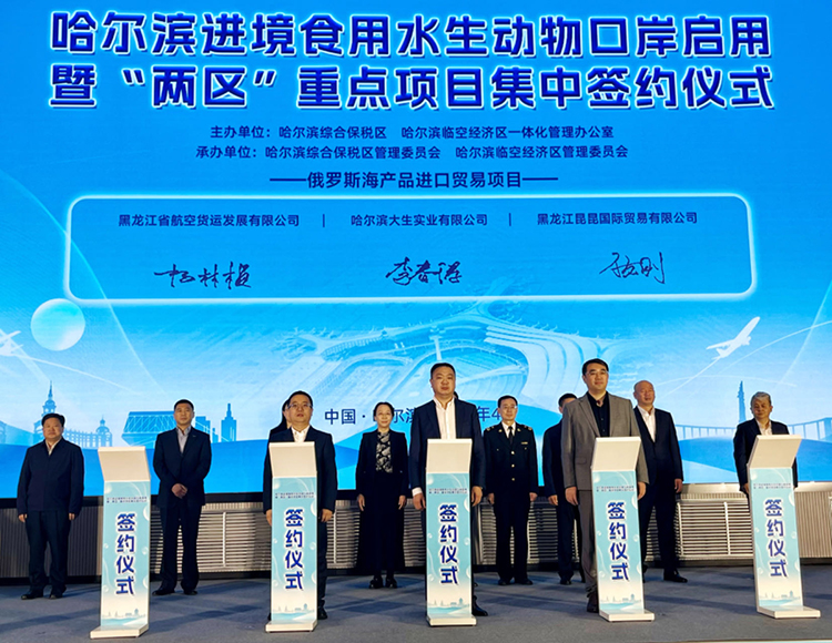 同日,哈爾濱進境食用水生動物口岸啟用暨“兩區(qū)”重點項目集中簽約儀式在哈爾濱臨空經(jīng)濟區(qū)舉行?!皟蓞^(qū)”一體化辦公室主任介紹了哈爾濱進境食用水生動物指定監(jiān)管場地和保稅航油項目基本情況。