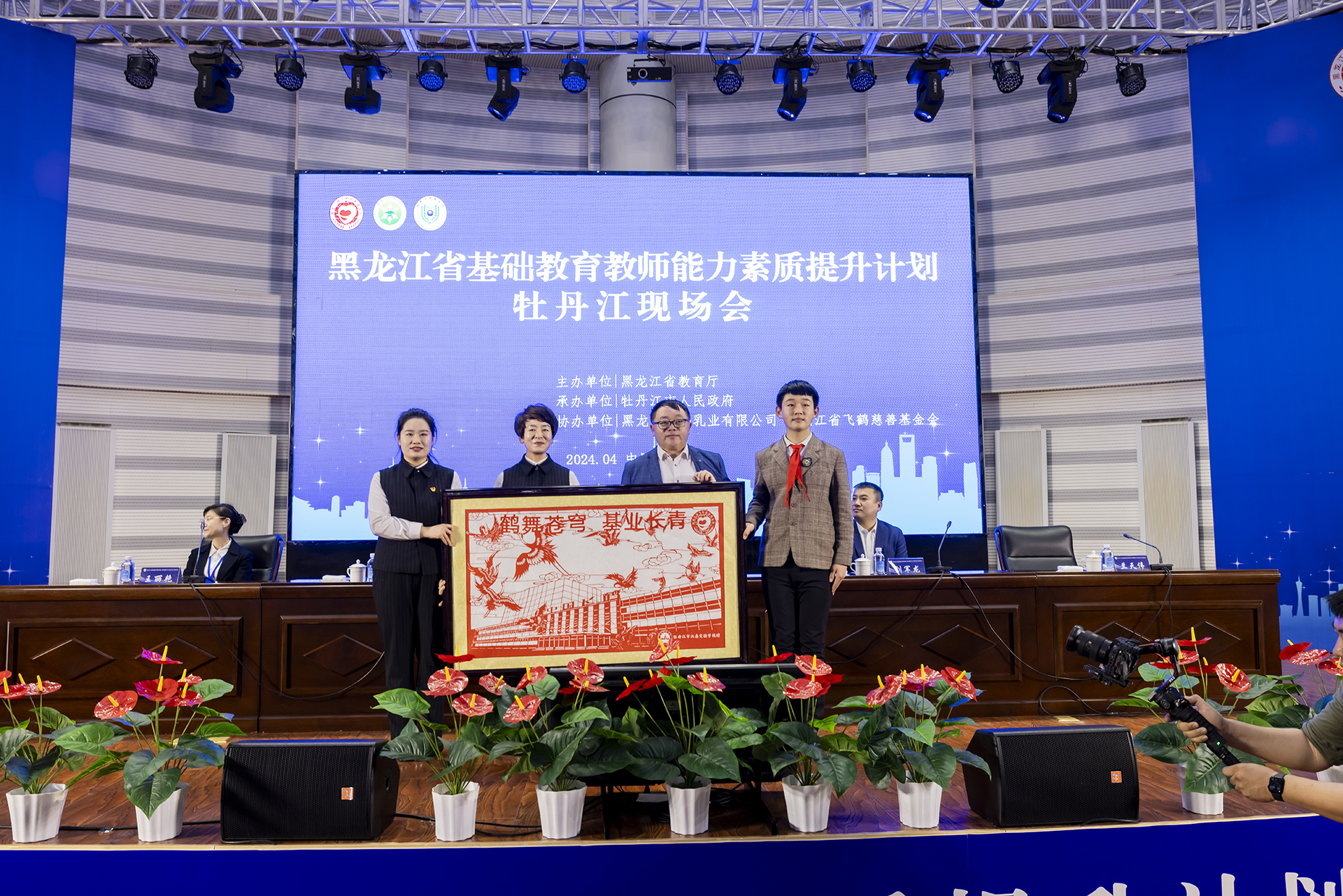 會議現(xiàn)場,牡丹江市江南實驗學(xué)校向中國飛鶴贈送剪紙作品,以表示全省師生對中國飛鶴助力龍江教育公益行動的感謝。