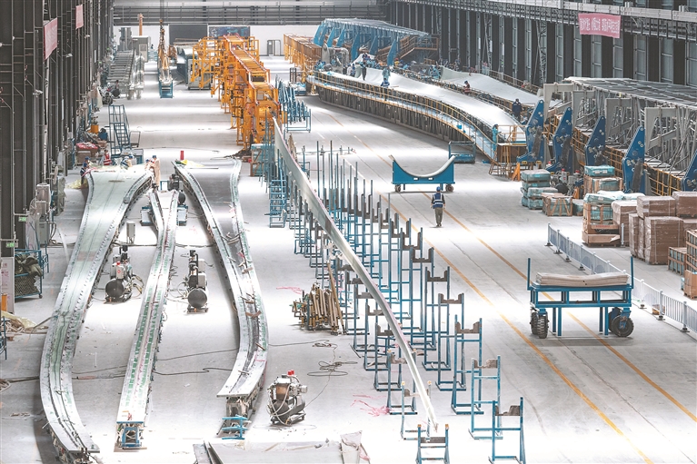 4月28日,在一重龍申(齊齊哈爾)復合材料有限公司,工作人員在廠區(qū)進行風電葉片生產(chǎn)作業(yè)。