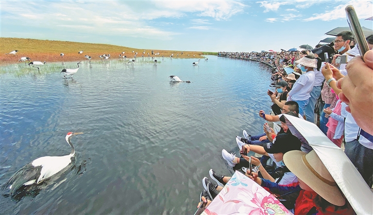 “五一”小長(zhǎng)假期間,扎龍國家級(jí)自然保護(hù)區(qū)內(nèi)碧波蕩漾、水草豐盛,游客行走在濕地的棧道上,感受微風(fēng)清涼,在自然大氧吧里暢快呼吸,看丹頂鶴野化馴飛,與丹頂鶴近距離互動(dòng),人鳥共生自然和諧。