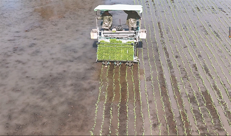 在樺南縣域內(nèi)的曙光農(nóng)場有限公司第三管理區(qū)水稻基地,種植戶們正忙著搬運秧苗。伴隨著轟鳴的機器聲,農(nóng)機手駕駛著裝配有北斗導航系統(tǒng)的高速插秧機開展作業(yè)。插秧機駛過之處,一株株秧苗從苗盤上依次滑落,均勻有序地插播在水田里。插秧機上,工人不時為插秧機補充秧苗,不一會兒,整片水田披上了綠裝,一行行整齊有序、間隔適中的秧苗在陽光下煥發(fā)著勃勃生機。