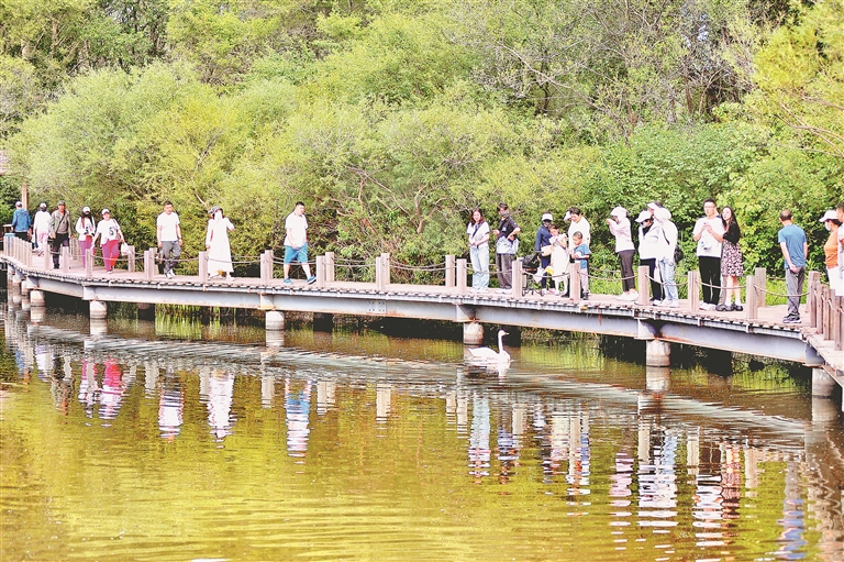 16日,陽光明媚,空氣清新,哈爾濱市迎來了好天氣。太陽島上,草木茂盛,百花爭(zhēng)艷,許多本地市民和南方游客組團(tuán)來到這里避暑游玩。有的游人搭起帳篷野餐,有的游人走上濕地棧道觀賞美麗風(fēng)景。孩子們玩過各種游樂項(xiàng)目后,再與小鹿、松鼠等小動(dòng)物來個(gè)親密接觸。