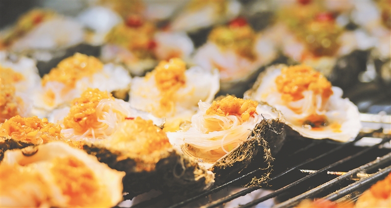 盛夏里,哈爾濱市中央大街的美食夜市燈火通明,人聲鼎沸,各種食物琳瑯滿目,空氣中彌漫著食物的香味。