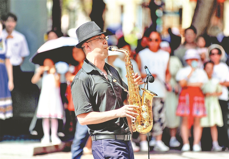 日前,哈爾濱市道里區(qū)中央大街與紅專街交口處,多位藝術(shù)家現(xiàn)場為人們表演,吸引許多游客圍觀。琵琶、薩克斯、手風(fēng)琴等樂器演奏的經(jīng)典樂曲,博得人們陣陣掌聲。美妙的旋律回蕩在街道上空,為百年老街增添了更多的藝術(shù)魅力。