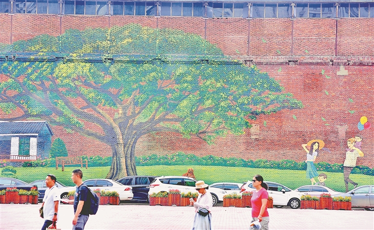 哈爾濱市道外區(qū)東直路上,路邊的花卉景觀與墻體彩繪互相映襯,成為街頭一道美麗風(fēng)景,引得人們紛紛駐足觀看。畫里的溪流、小徑、樹(shù)木、花草、動(dòng)物與畫外的綠地巧妙結(jié)合起來(lái),融為一個(gè)整體,創(chuàng)意新穎,視覺(jué)效果良好,讓人眼前一亮。
