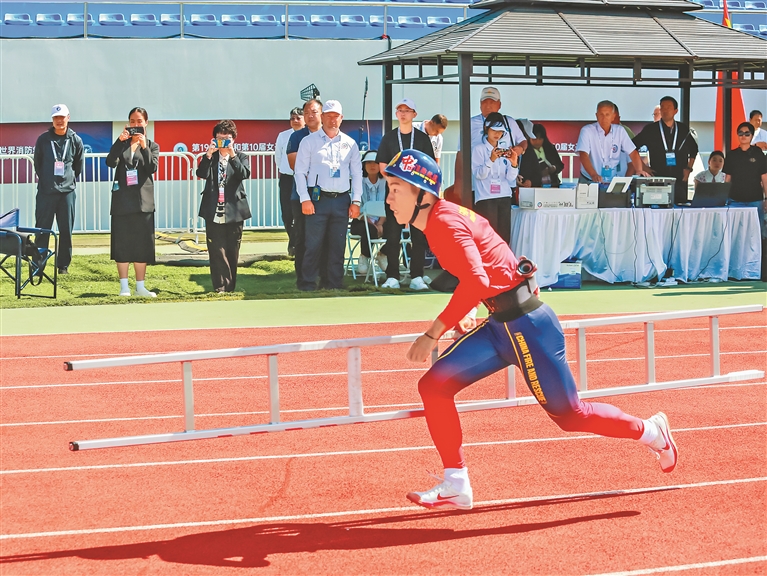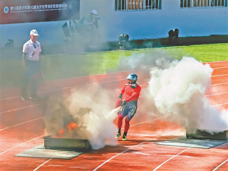 本報(bào)9日訊(記者蔡韜)9日上午,在世界消防救援錦標(biāo)賽男子消防4×100米接力比賽中,中國隊(duì)跑出55秒62的好成績,獲得第一名。