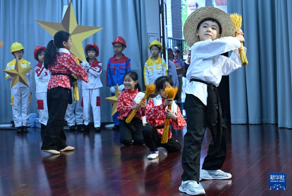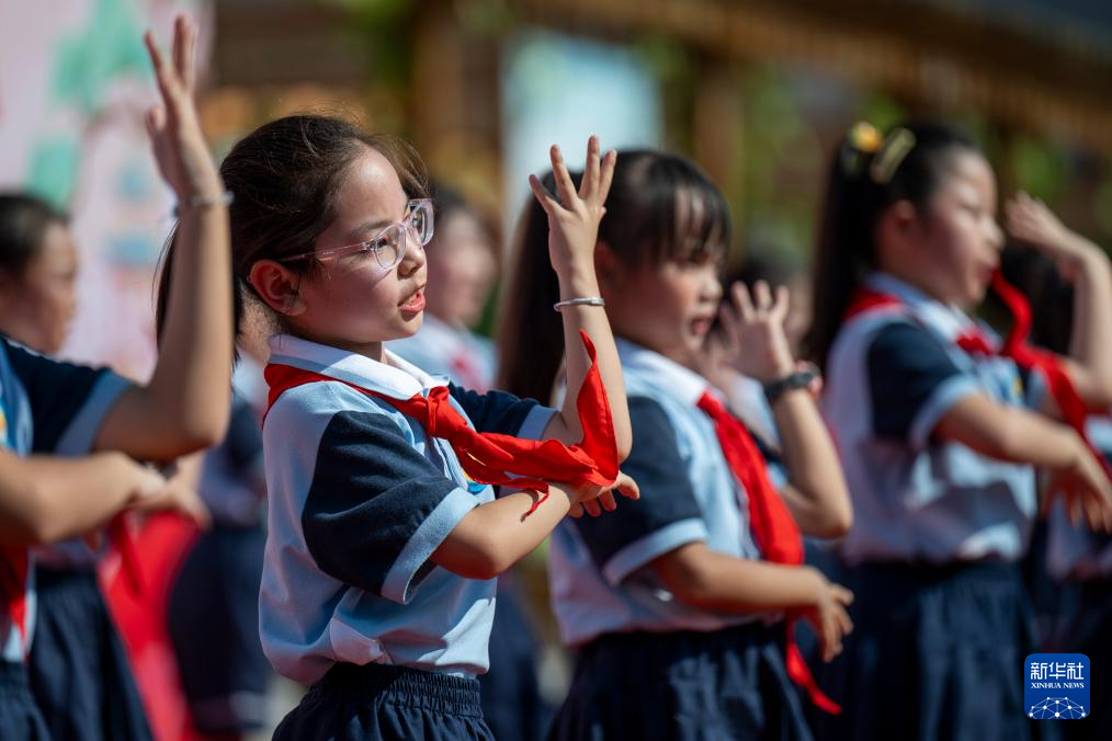 9月30日,湖北省黃石市沈家營小學(xué)的小朋友們?cè)谟瓏鴳c活動(dòng)上表演節(jié)目。新華社記者 伍志尊 攝