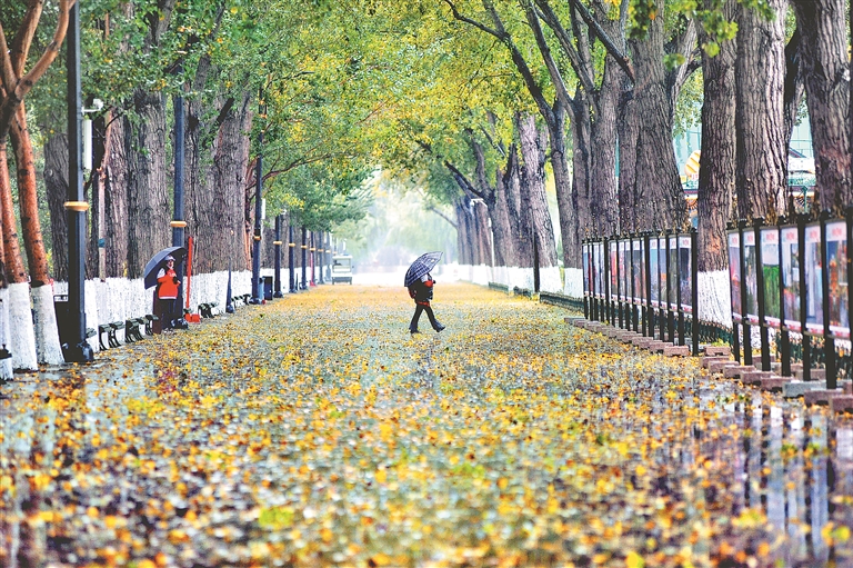 雨中秋意濃。10日一場秋雨,哈爾濱街道兩側(cè)的樹葉紛紛飄落,滿地落葉如同一層金色地毯,為秋日冰城增添了更多魅力。外出的人們撐起五顏六色的雨傘,走在落葉間,構(gòu)成了一幅幅美麗的油畫。